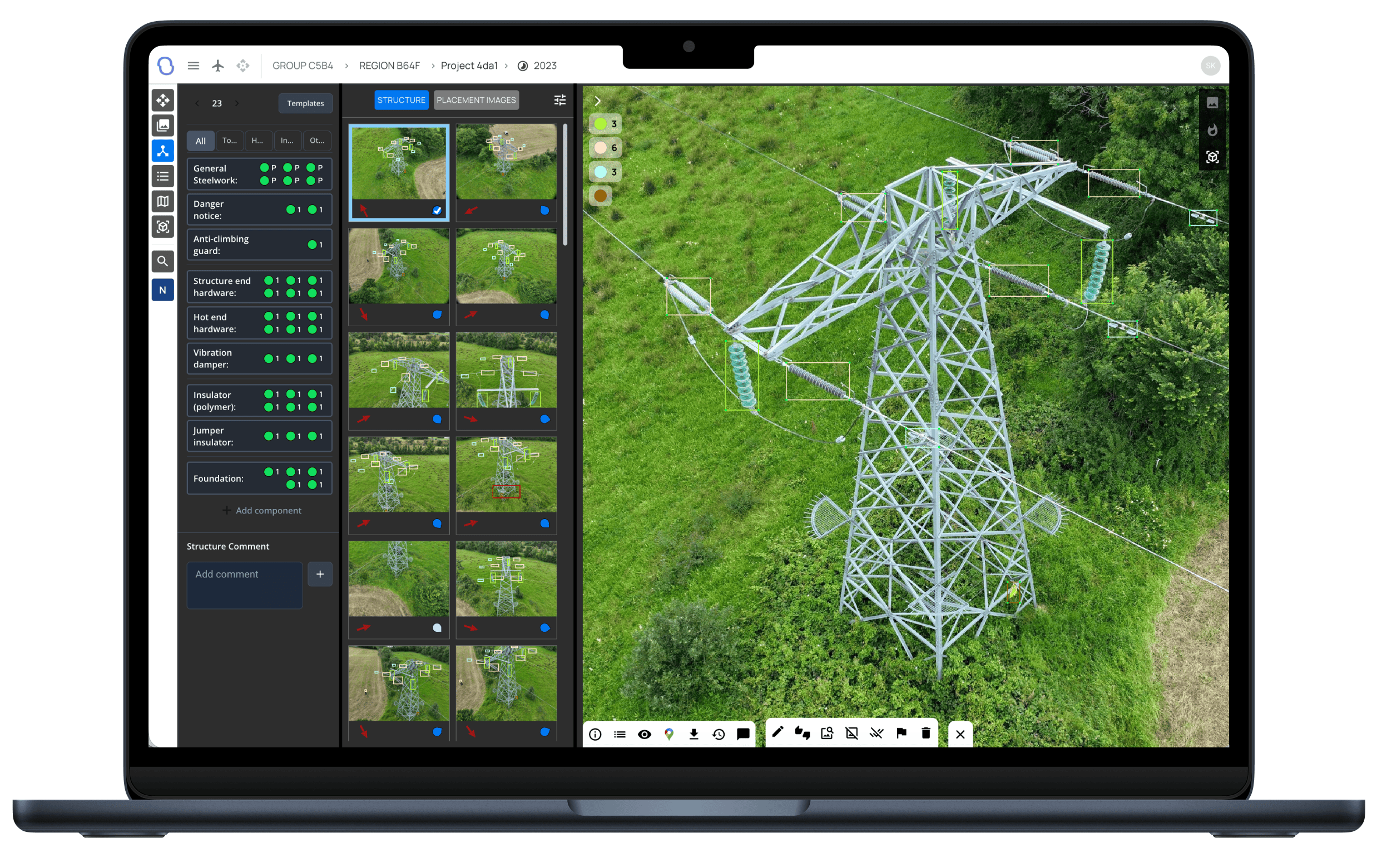 Each detection is automatically linked to its asset location, voltage level, and metadata. Arkion structures data at pole level—even for complex lattice towers—so every component can be traced, searched, and compared across inspection cycles.