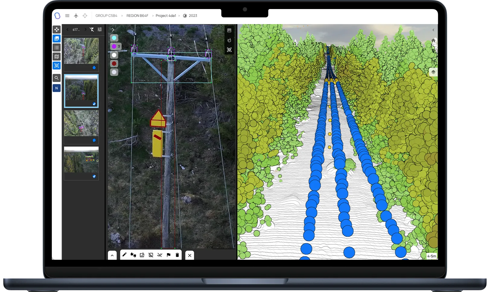 The interface is designed specifically for grid visualization—linking every image, LiDAR point, and measurement to real assets. Switch between layers, zoom into structures, or inspect components in 3D to fully understand your network’s health.
